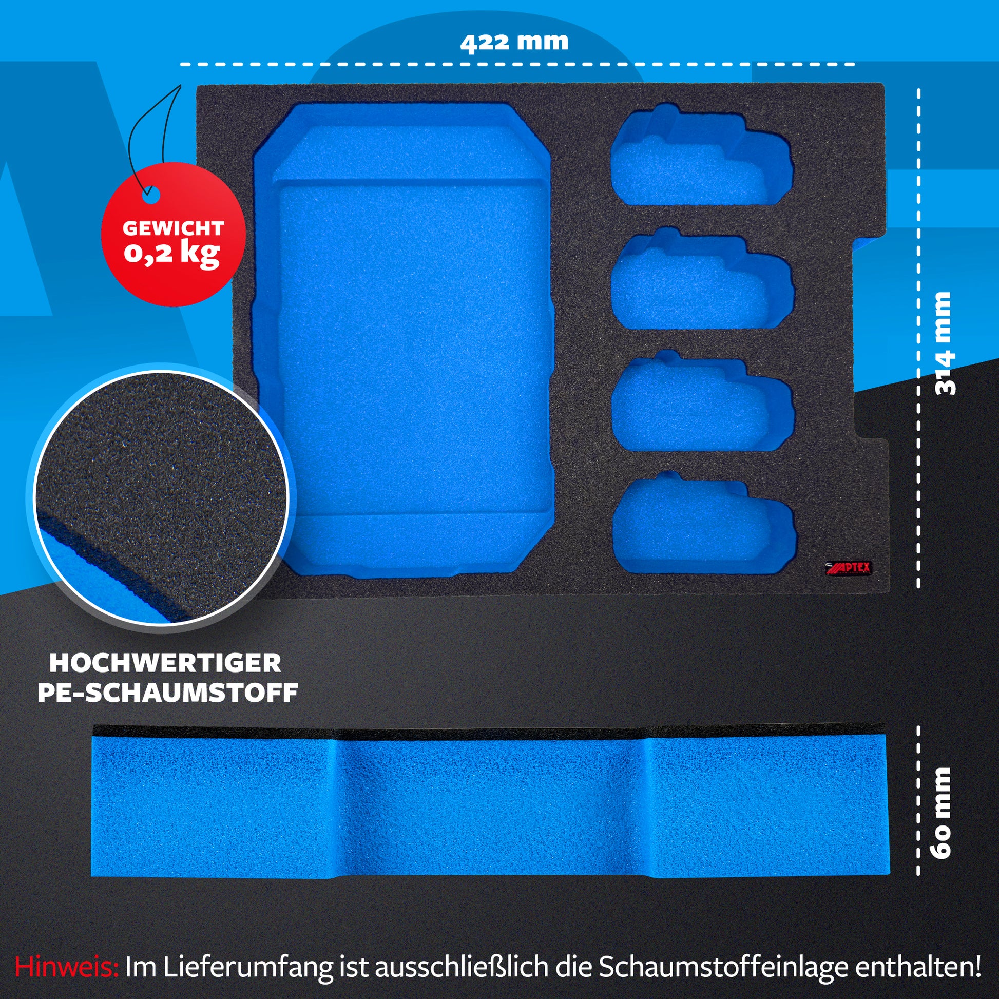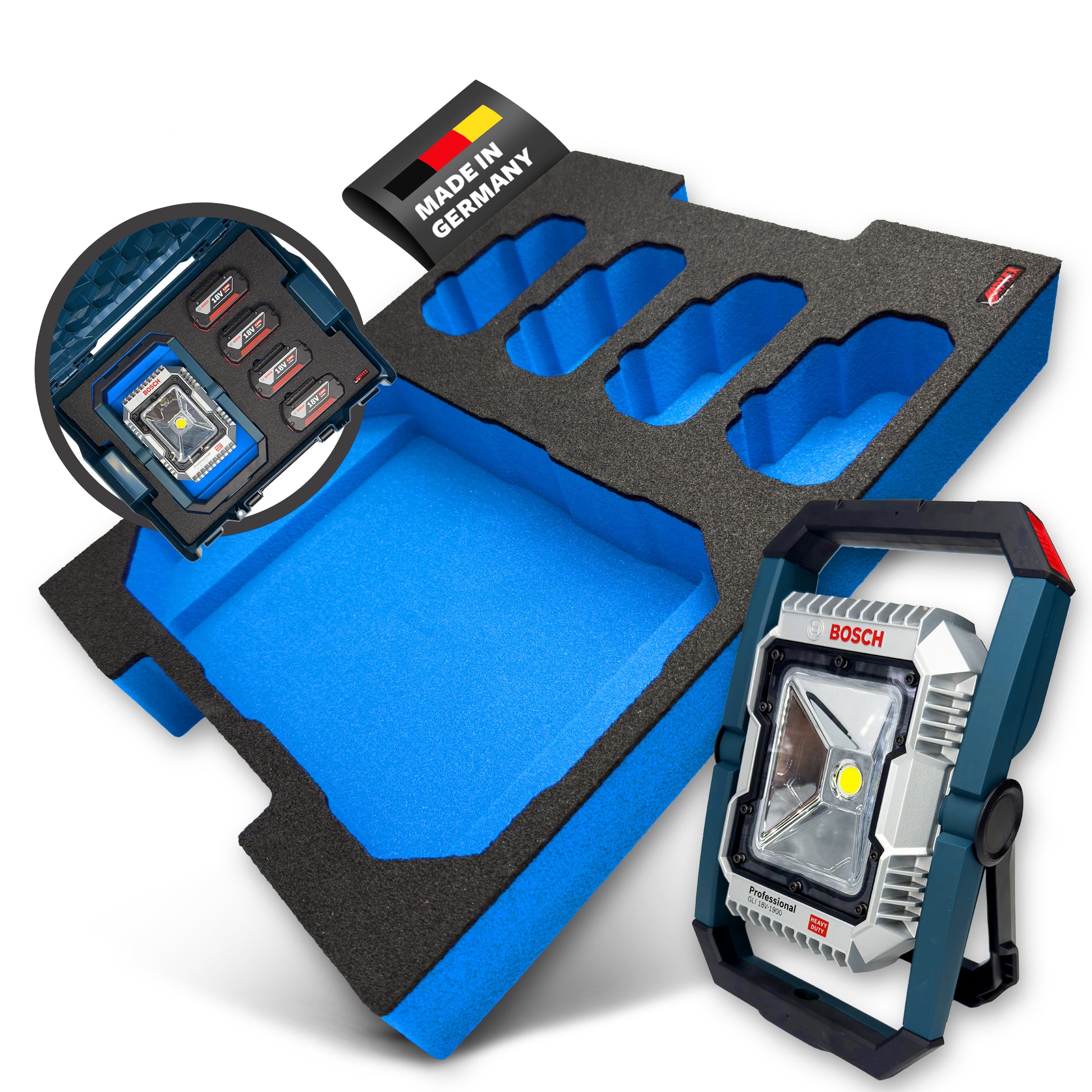 APTEX Bosch GLI 18V-1900 + Akkus 18V GBA Einlage für L-Boxx 136 – Akku-Arbeitsleuchte Schaumeinlage – Made in Germany